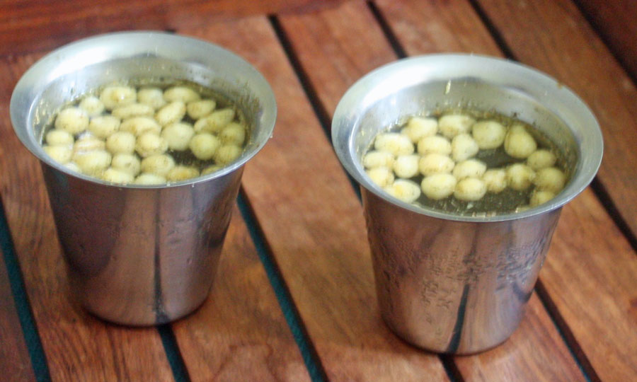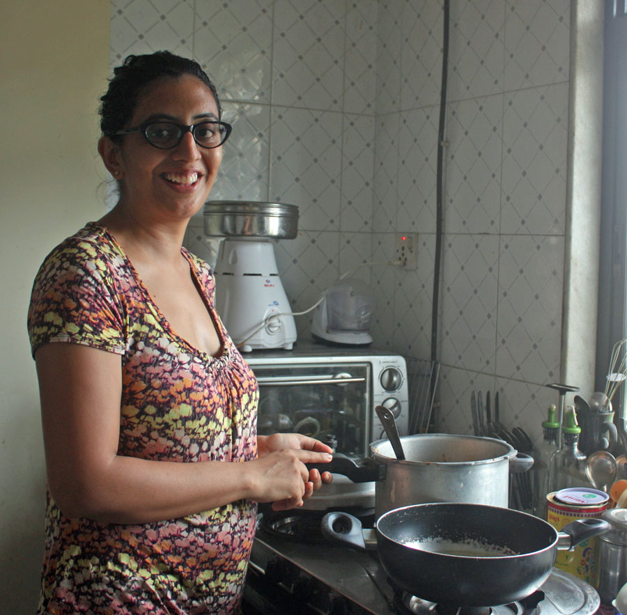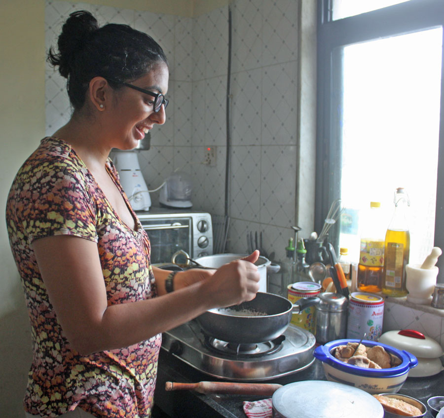 Malvika and her dog will greet you at the door of her apartment. Once you settle in she will offer you a refreshing welcome drink made with cumin seeds and served with boondi (crisp, fried gram flour balls). As you snack on appetizers suck as pakora (fritters) or dahi bhalla (lentil dumplings in yougurt sauce) Malvika will tell you about her culinary and cultural background. She might tell you about how her father gave her a cooker for her birthday when she was learning to cook, or how her marriage into a Maharashtrian household and her new life in tropical Mumbai introduced her to Konkani cuisine, which she has completely integrated into her culinary repertoire.